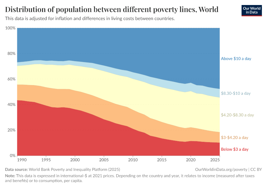 Extreme poverty — indeed a very extreme poverty line — is defined by the “International Poverty Line,” which is living on less than $2.15 per day. This line is set by the World Bank and used by the UN to monitor extreme poverty worldwide. In these measurements, statisticians adjust for inflation and price differences between countries. You can read more about this adjustment in our article here.