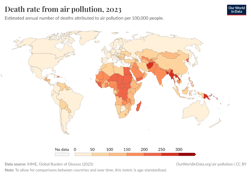In the interactive map, we show death rates from air pollution across the world, measured as the number of deaths per 100,000 people in a given country or region.