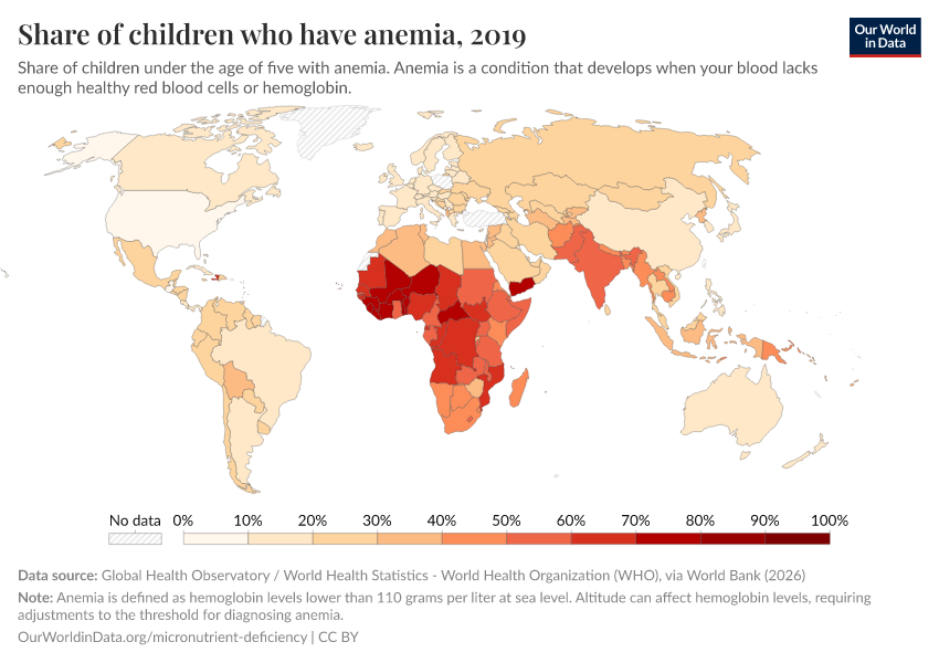 The maps below show the estimated share of children and women of reproductive age who have anemia. It’s much more common in Sub-Saharan Africa and South Asia, where the majority are anemic. But even in richer countries, less than a handful have rates below 10%.