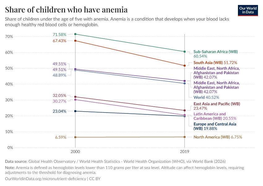 Reductions among children have been slightly more promising: the share of under-fives that are anemic dropped from 48% to 39% between 2000 and 2019.