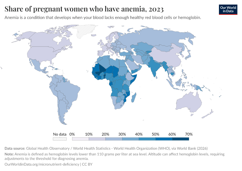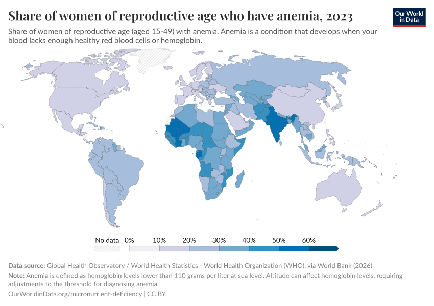 However, progress in reducing rates of anemia has been incredibly slow in recent decades. Globally, the share of pregnant women and women of reproductive age who are anemic has not changed since 2000.