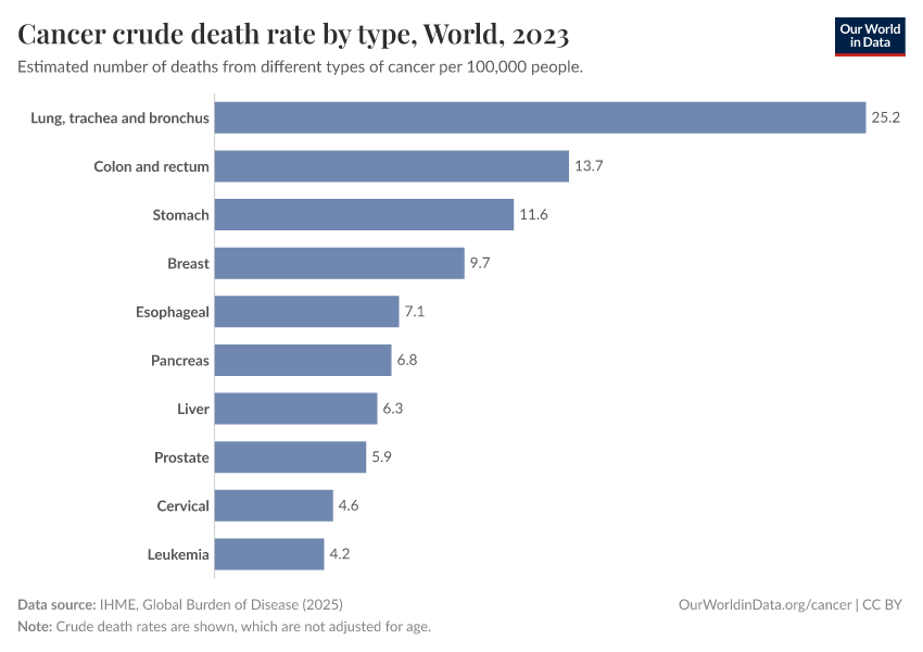 The share of cancer deaths from each type varies between countries. You can explore an interactive chart for different countries showing the relative share of all cancer deaths from each cancer type here: