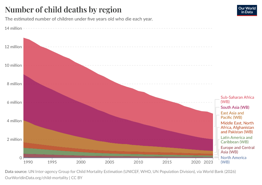 Saloni Dattani, Fiona Spooner, Hannah Ritchie, and Max Roser (2023) - “Child and Infant Mortality” Published online at OurWorldinData.org. Retrieved from: 'https://search-refactor-react-query.owid.pages.dev/child-mortality' [Online Resource]BibTeX citation