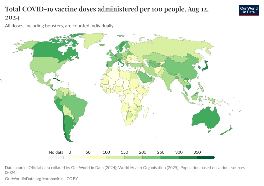 The following map and chart show the number of vaccine doses administered per 100 people within a given population. Each dose, including boosters, is counted as an individual dose.