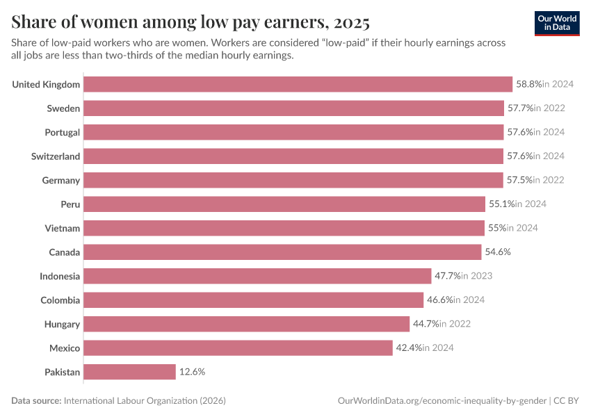 Above we show that women all over the world are underrepresented in high-profile jobs, which tend to be better paid. As it turns out, in many countries women are at the same time overrepresented in low-paying jobs.