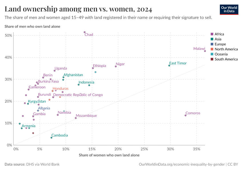 Economic inequalities between men and women manifest themselves not only in terms of wages earned but also in terms of assets owned. For example, as the chart shows, in nearly all low and middle-income countries with data, men are more likely to own land than women.
