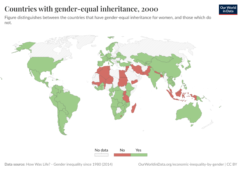 Inheritance is one of the main mechanisms for the accumulation of assets. In the map, we provide an overview of the countries that do and do not have gender-equal inheritance systems.