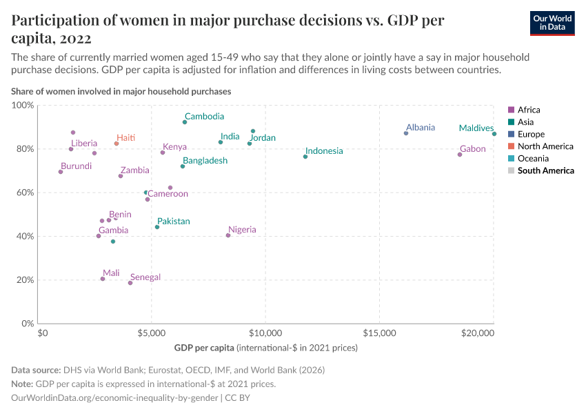 In this chart, we plot the share of currently married women who report having a say in major household purchase decisions, against national GDP per capita.