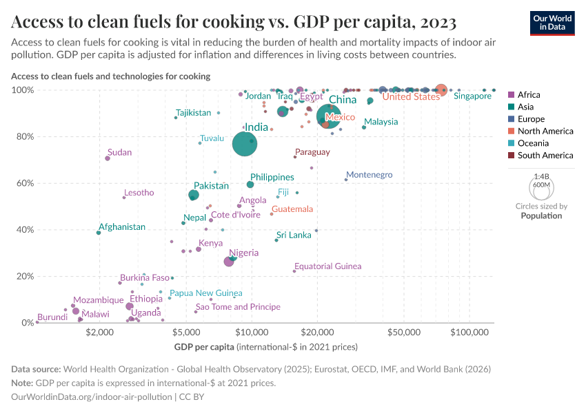 The availability (and affordability) of electricity and clean fuels for cooking is strongly related to income. Poor energy access is strongly tied to having a low income.