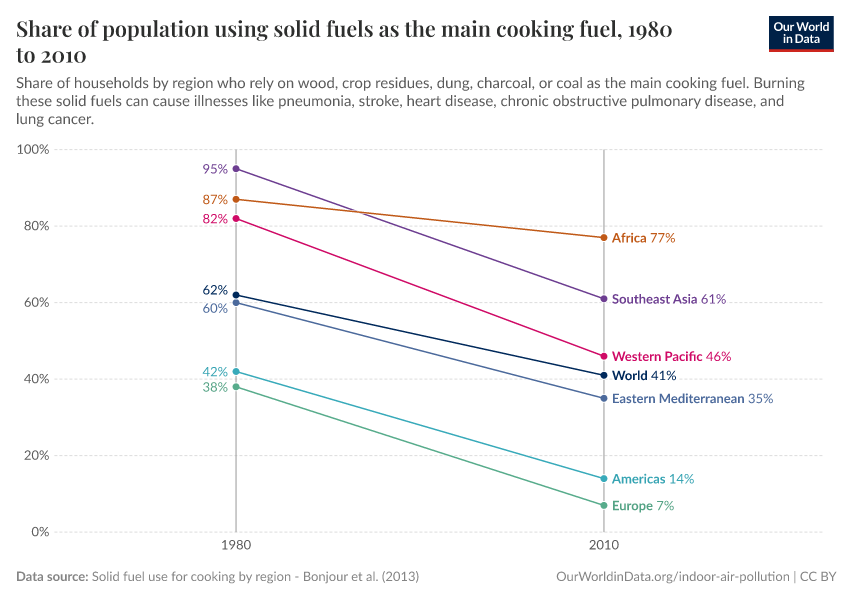 The use of solid fuels is declining in all of the world’s regions. However, the success of rapidly developing Southeast Asia is particularly impressive. Here, there has been a remarkable decline in the use of solid fuels, shifting from nearly all of the population to just over half.