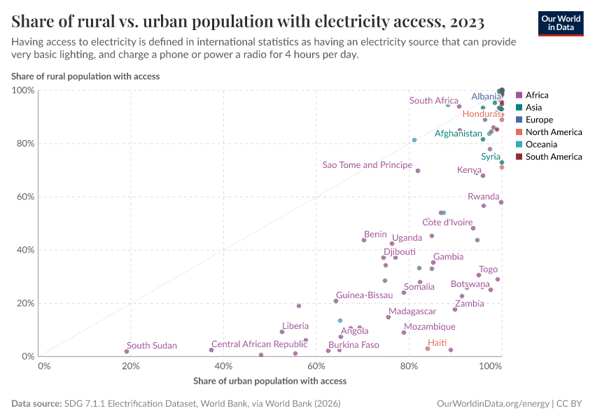 In the chart, we have plotted the percentage of the rural population with electricity access (on the y-axis) versus the percentage of the urban population with access (on the x-axis).
