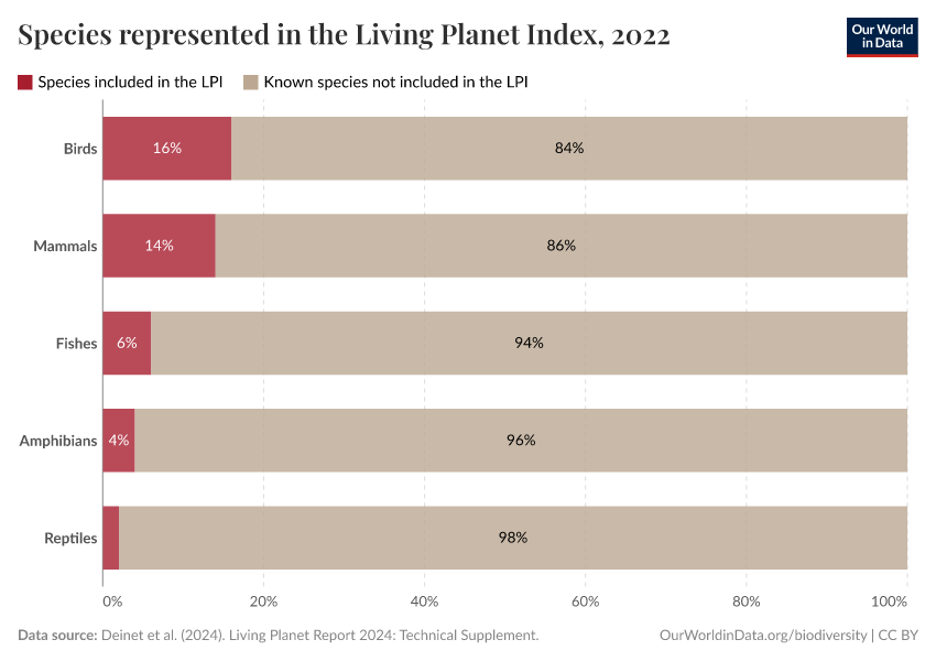 The LPI only includes data from vertebrate populations. This includes mammals, birds, reptiles, amphibians, and fish. Taxonomic groups including insects, corals, fungi, and plants are not included.