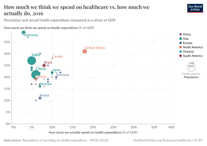 As we see, all countries included in the survey lie above a hypothetical parity diagonal (i.e. a line with slope one), meaning that people everywhere think they spend more on healthcare than they actually do. In those countries that lie closest to the parity diagonal, people have a more accurate perception of health spending.
