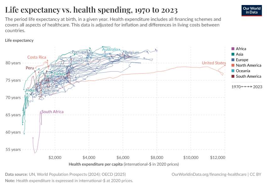 The association between health spending and increasing life expectancy also holds for rich countries in Europe, Asia, and North America in the upper right corner of the chart. The US is an outlier that achieves only a comparatively short life expectancy considering the fact that the country has by far the highest health expenditure of any country in the world. We will get back to this below.