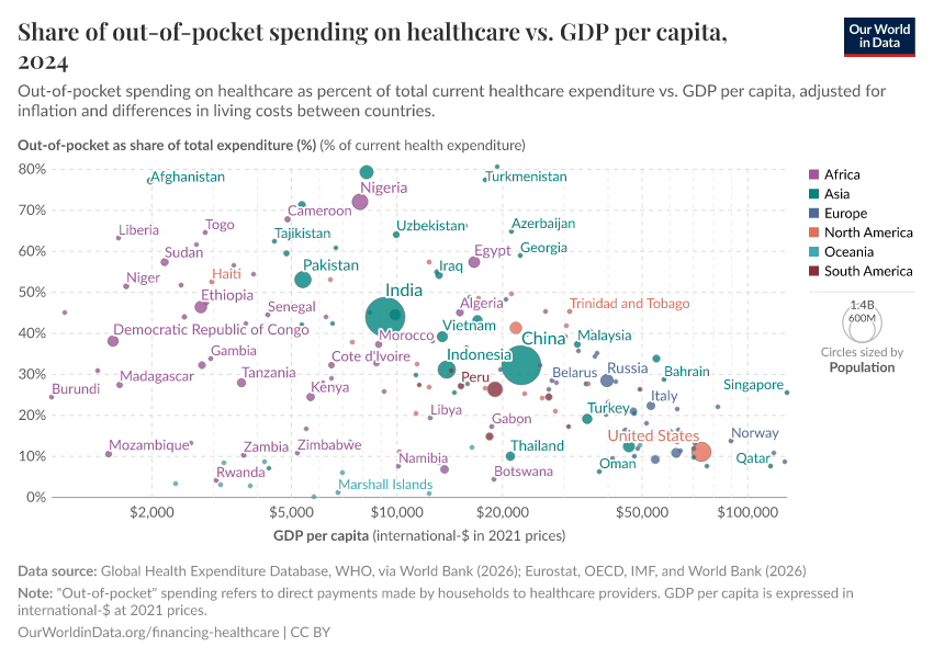 In countries where healthcare is principally financed through public funds, out-of-pocket spending is typically low; this is natural since in these countries there is essentially universal coverage through public insurance (e.g. Cuba, UK, Sweden, France). By the same logic, out-of-pocket spending is also low in countries where healthcare is largely financed through private funds in the form of private voluntary insurance (e.g. US). It is in countries with low public healthcare spending and low private voluntary insurance that out-of-pocket expenditure is high (e.g. India, Afghanistan, Sudan).