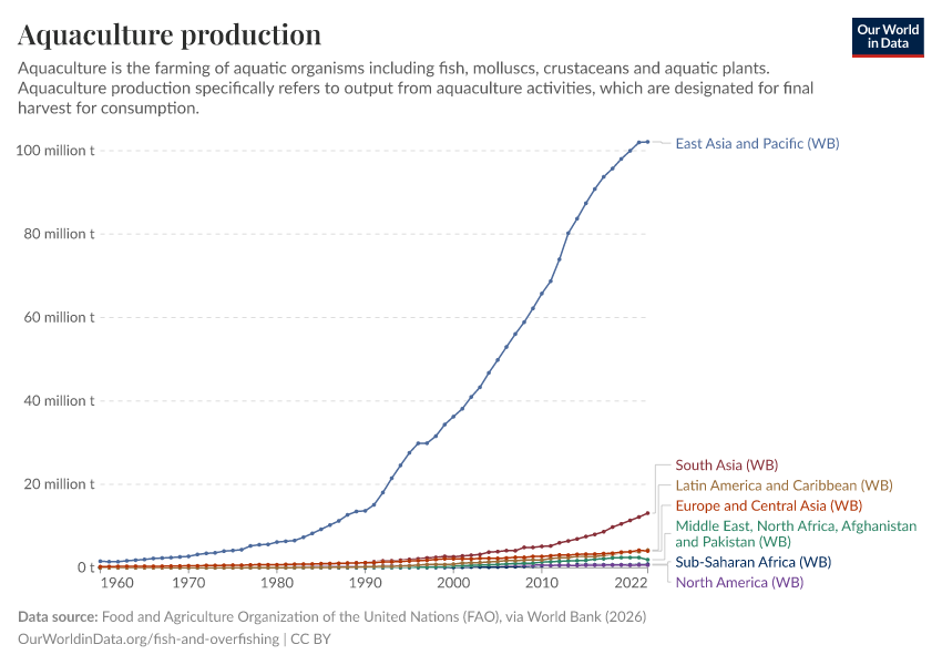 Most of the world’s growth in aquaculture production has come from East Asia and the Pacific. For example, China produces more food from aquaculture than any other country.