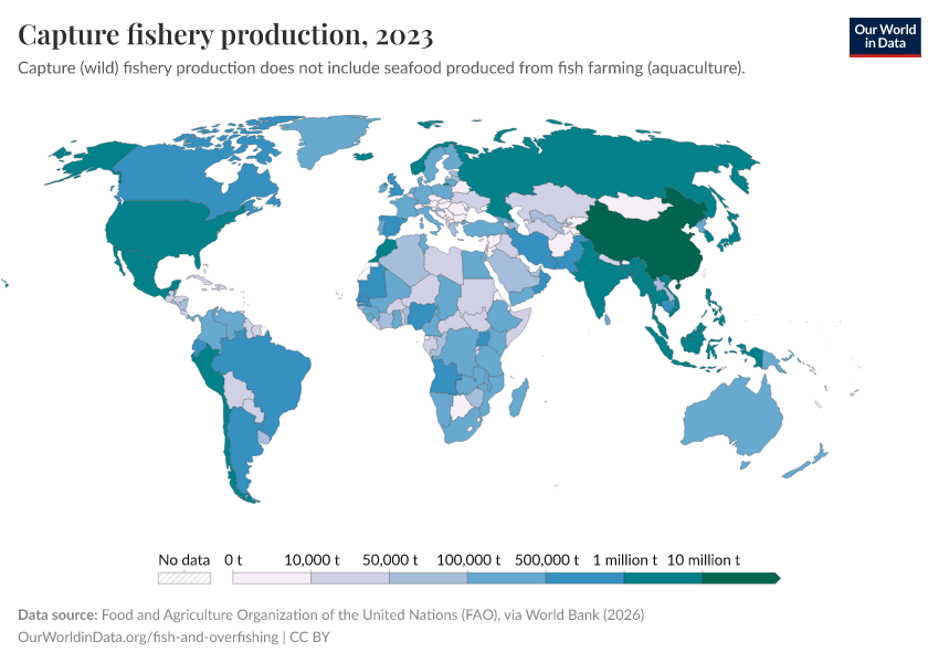 The chart here shows the distribution of wild fish catch by country. This is total seafood production minus aquaculture (fish farming).