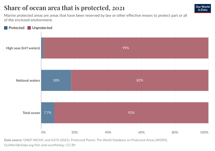 As of 2021, 7.7% of the total ocean is protected. This means 92% is unprotected.