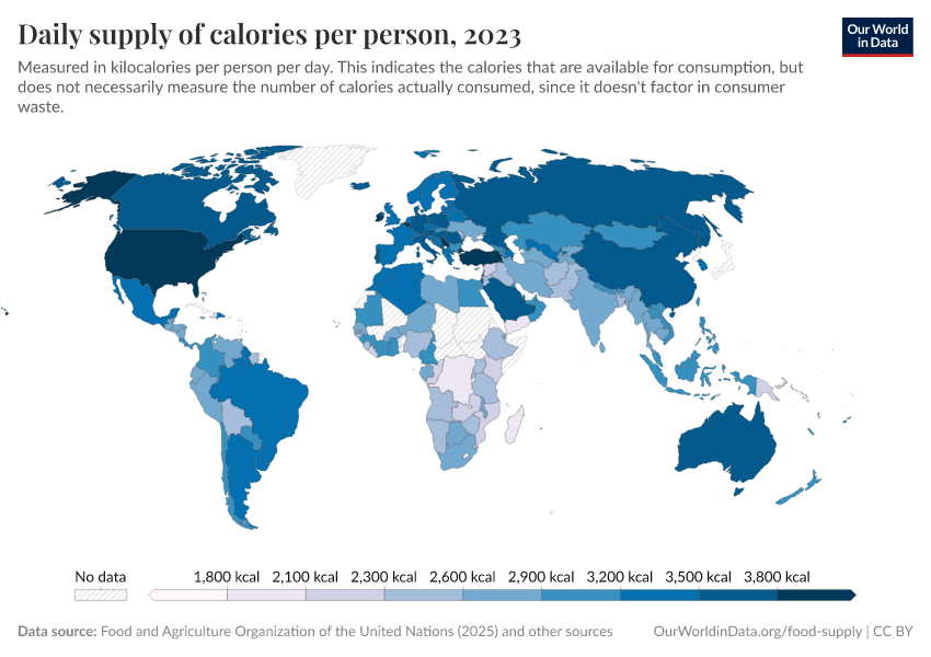 Max Roser, Hannah Ritchie, and Pablo Rosado (2013) - “Food Supply” Published online at OurWorldinData.org. Retrieved from: 'https://search-refactor-react-query.owid.pages.dev/food-supply' [Online Resource]BibTeX citation