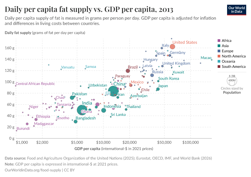 In this interactive map, we see the differences in how much fat each person gets every day in different countries.