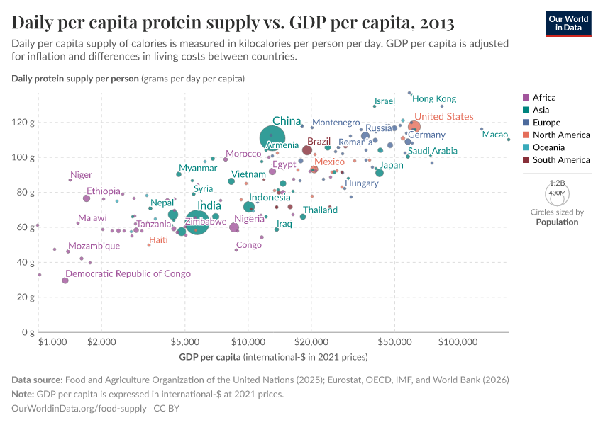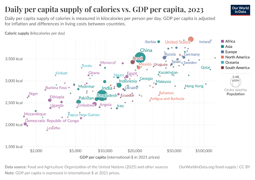In the sub-sections below we have plotted the relationship between daily per capita food supply (in the form of calories, protein, and then fat) versus gross domestic product (GDP) per capita in 2011 international-$. Several countries selected across a range of income levels and global regions have been highlighted for comparison. For all three measures of food supply, we see a close correlation between per capita supply and prosperity. As we get richer, per capita supply tends to increase.