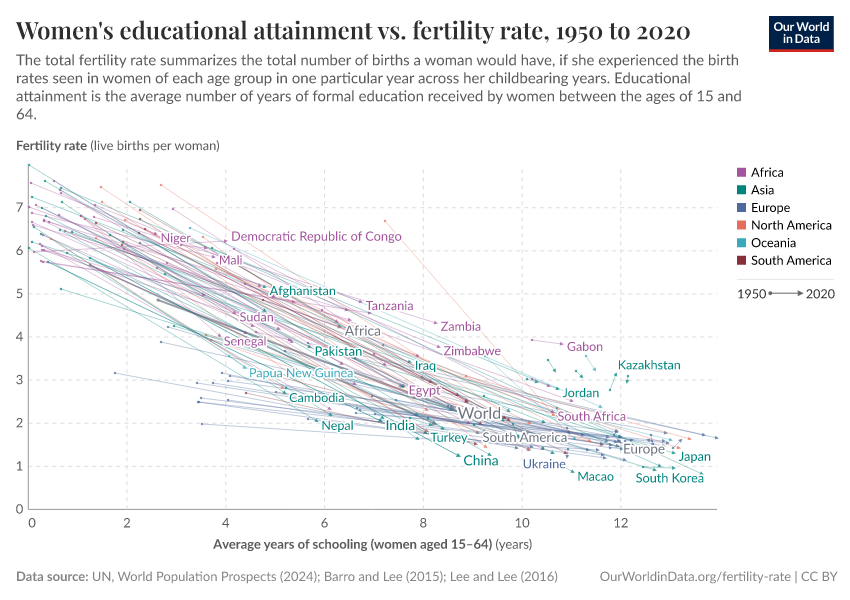 What we see is that, when women had on average fewer than 2 years of education — back in the 1950s — the fertility rate was between 5 and 8 children per woman.