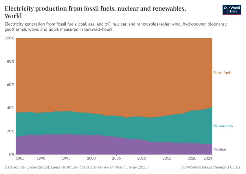 In the chart here we see trends in electricity production2 from renewable technologies, nuclear, and fossil fuels. These figures are given as the percentage contribution to total global electricity production.