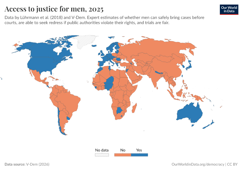 “Data Page: Access to justice for men”, part of the following publication: Bastian Herre, Lucas Rodés-Guirao, and Esteban Ortiz-Ospina (2013) - “Democracy”. Data adapted from V-Dem. Retrieved from https://search-refactor-react-query.owid.pages.dev/grapher/access-to-justice-men-row [online resource]How to cite this data