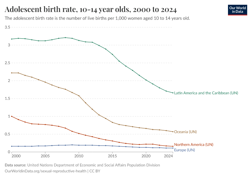 Population Division, Department of Economic and Social Affairs and United Nations Population Fund – processed by Our World in Data. “Adolescent birth rate, 10-14 year olds” [dataset]. Population Division, Department of Economic and Social Affairs and United Nations Population Fund, “Data from multiple sources” [original data]. Retrieved September 17, 2025 from https://search-refactor-react-query.owid.pages.dev/grapher/adolescent-fertility
