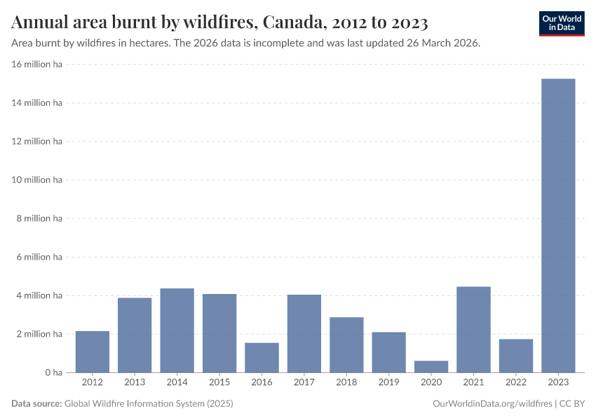 “Data Page: Annual area burnt by wildfires”, part of the following publication: Hannah Ritchie, Pablo Rosado, and Veronika Samborska (2024) - “Climate Change”. Data adapted from Global Wildfire Information System. Retrieved from https://search-refactor-react-query.owid.pages.dev/grapher/annual-area-burnt-by-wildfires [online resource]How to cite this data