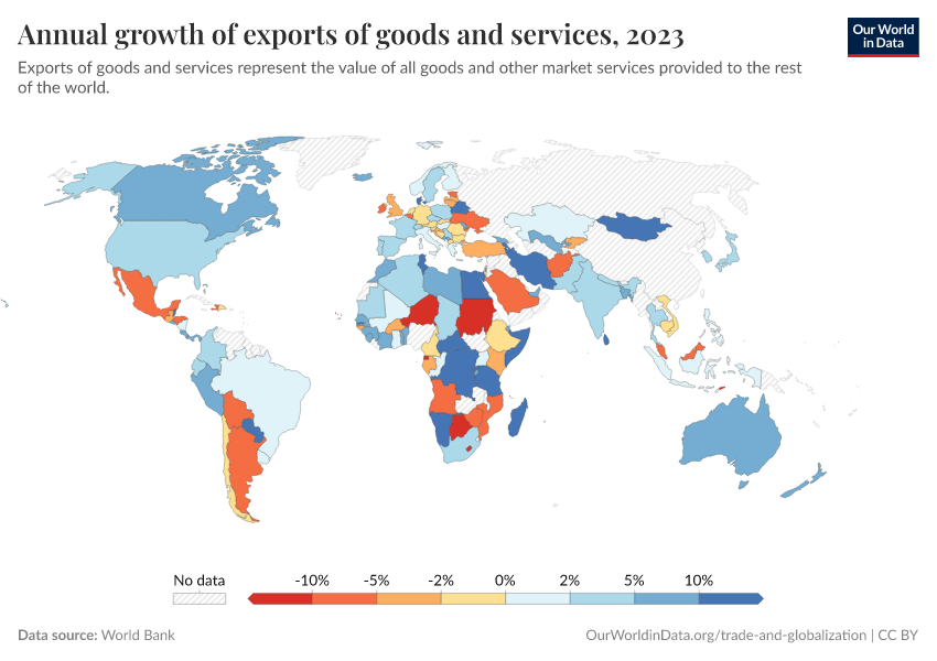 “Data Page: Annual growth of exports of goods and services”. Our World in Data (2025). Data adapted from World Bank. Retrieved from https://search-refactor-react-query.owid.pages.dev/grapher/annual-growth-of-exports-of-goods-and-services [online resource]How to cite this data