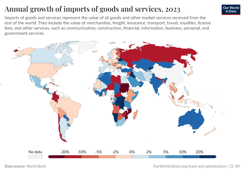 World Bank – processed by Our World in Data. “Annual growth of imports of goods and services” [dataset]. World Bank, “World Bank national accounts data, and OECD National Accounts data files.” [original data]. Retrieved September 17, 2025 from https://search-refactor-react-query.owid.pages.dev/grapher/annual-growth-of-imports-of-goods-and-services
