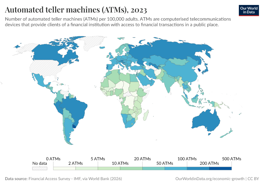 International Monetary Fund, via World Bank (2025) – processed by Our World in Data. “Automated teller machines (ATMs)” [dataset]. International Monetary Fund, via World Bank, “World Development Indicators” [original data]. Retrieved September 17, 2025 from https://search-refactor-react-query.owid.pages.dev/grapher/automated-teller-machines-atms-per-100000-adults