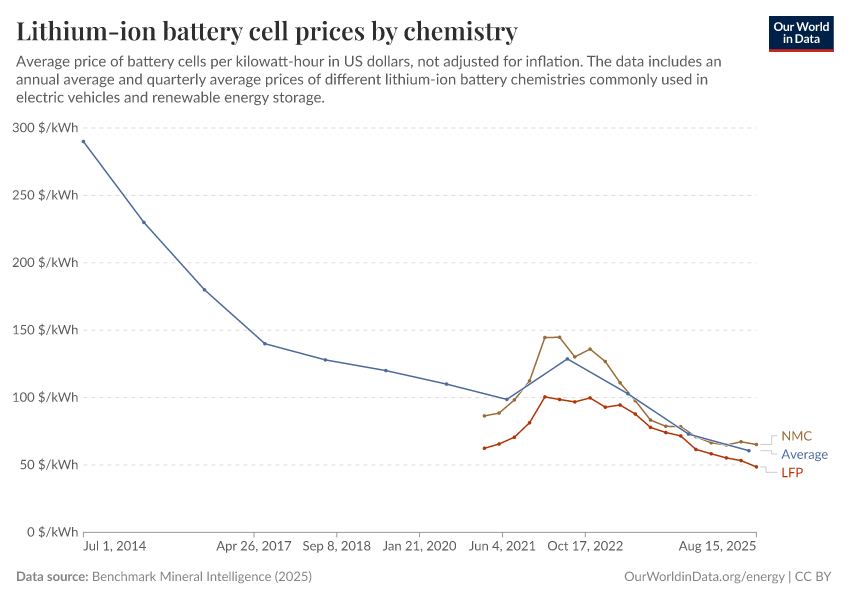 Benchmark Mineral Intelligence (2024) – with minor processing by Our World in Data. “Lithium ion battery cell price” [dataset]. Benchmark Mineral Intelligence, “Lithium ion batteries prices”; Benchmark Mineral Intelligence, “Batteries prices by chemistry” [original data]. Retrieved September 17, 2025 from https://search-refactor-react-query.owid.pages.dev/grapher/average-battery-cell-price