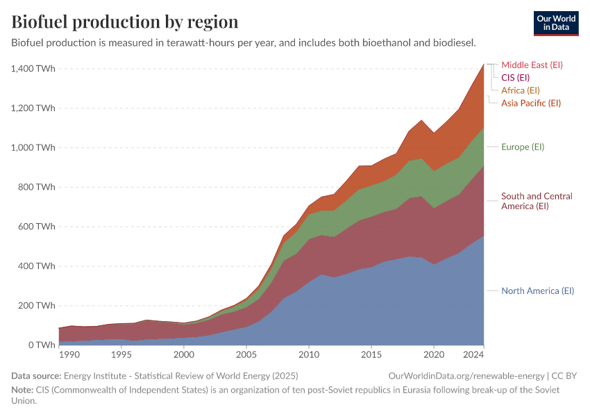Energy Institute - Statistical Review of World Energy (2024) – with major processing by Our World in Data. “Biofuels production” [dataset]. Energy Institute, “Statistical Review of World Energy” [original data]. Retrieved September 17, 2025 from https://search-refactor-react-query.owid.pages.dev/grapher/biofuels-production-by-region