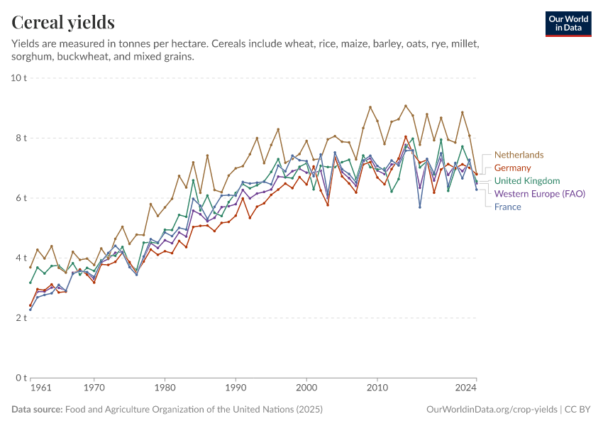 Food and Agriculture Organization of the United Nations (2025) – with major processing by Our World in Data. “Cereal yields – UN FAO” [dataset]. Food and Agriculture Organization of the United Nations, “Production: Crops and livestock products” [original data]. Retrieved September 17, 2025 from https://search-refactor-react-query.owid.pages.dev/grapher/cereal-yield