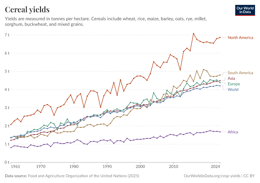 Food and Agriculture Organization of the United Nations (2025) – with major processing by Our World in Data. “Cereal yields – UN FAO” [dataset]. Food and Agriculture Organization of the United Nations, “Production: Crops and livestock products” [original data]. Retrieved September 17, 2025 from https://search-refactor-react-query.owid.pages.dev/grapher/cereal-yield