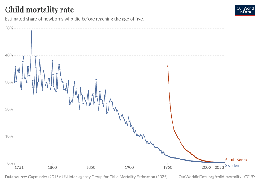Gapminder (2015); UN Inter-agency Group for Child Mortality Estimation (2025) – processed by Our World in Data. “Child mortality rate – Gapminder; UN IGME – Long-run data” [dataset]. United Nations Inter-agency Group for Child Mortality Estimation, “United Nations Inter-agency Group for Child Mortality Estimation”; Gapminder, “Child mortality rate under age five v7”; Gapminder based on UN IGME & UN WPP, “Under-five Mortality v11”; Various sources, “Population” [original data]. Retrieved September 17, 2025 from https://search-refactor-react-query.owid.pages.dev/grapher/child-mortality