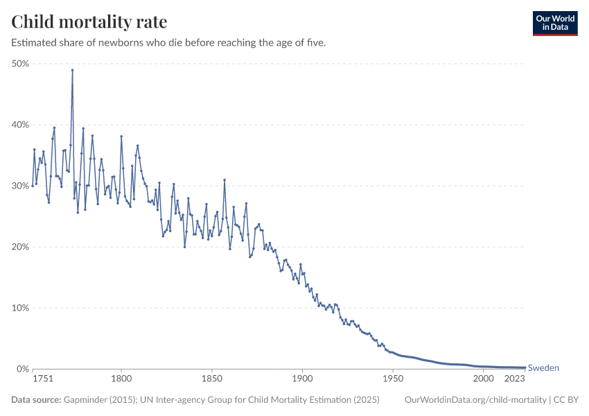 Gapminder (2015); UN Inter-agency Group for Child Mortality Estimation (2025) – processed by Our World in Data. “Child mortality rate – Gapminder; UN IGME – Long-run data” [dataset]. United Nations Inter-agency Group for Child Mortality Estimation, “United Nations Inter-agency Group for Child Mortality Estimation”; Gapminder, “Child mortality rate under age five v7”; Gapminder based on UN IGME & UN WPP, “Under-five Mortality v11”; Various sources, “Population” [original data]. Retrieved September 17, 2025 from https://search-refactor-react-query.owid.pages.dev/grapher/child-mortality