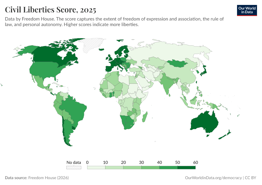 Freedom House (2024) – processed by Our World in Data. “Civil liberties score” [dataset]. Freedom House, “Freedom in the World” [original data]. Retrieved September 17, 2025 from https://search-refactor-react-query.owid.pages.dev/grapher/civil-liberties-score-fh