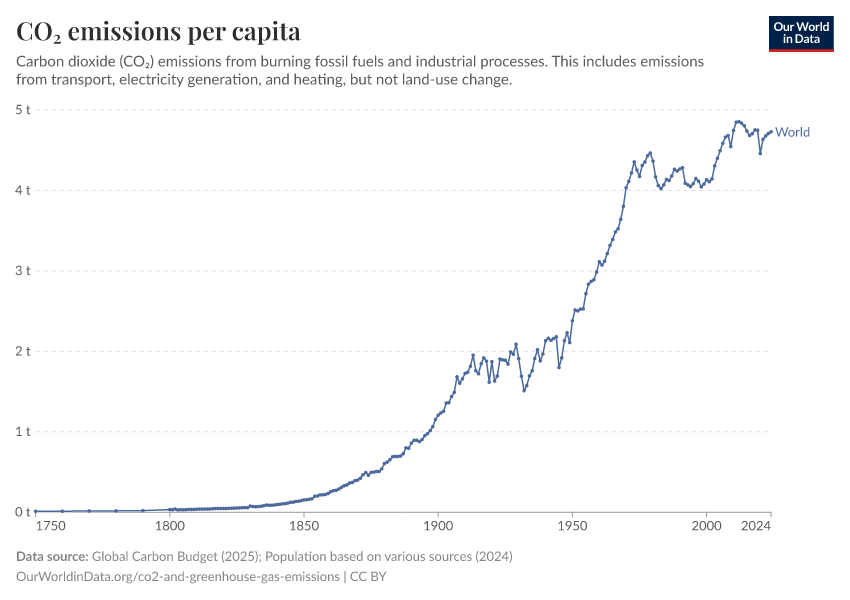 “Data Page: CO₂ emissions per capita”, part of the following publication: Hannah Ritchie, Pablo Rosado, and Max Roser (2023) - “CO₂ and Greenhouse Gas Emissions”. Data adapted from Global Carbon Project, Various sources. Retrieved from https://search-refactor-react-query.owid.pages.dev/grapher/co-emissions-per-capita [online resource]How to cite this data