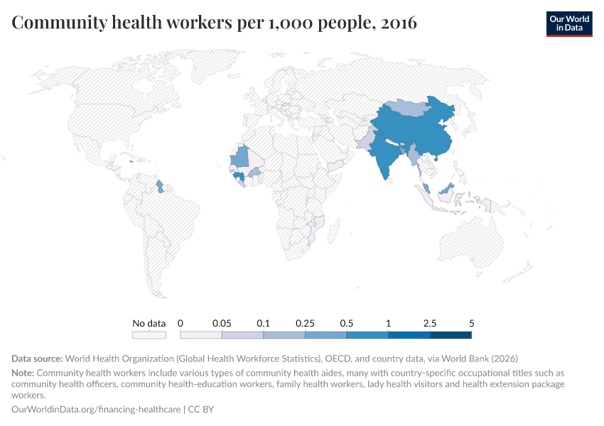 “Data Page: Community health workers per 1,000 people”. Our World in Data (2025). Data adapted from World Health Organization and OECD, via World Bank. Retrieved from https://search-refactor-react-query.owid.pages.dev/grapher/community-health-workers [online resource]How to cite this data
