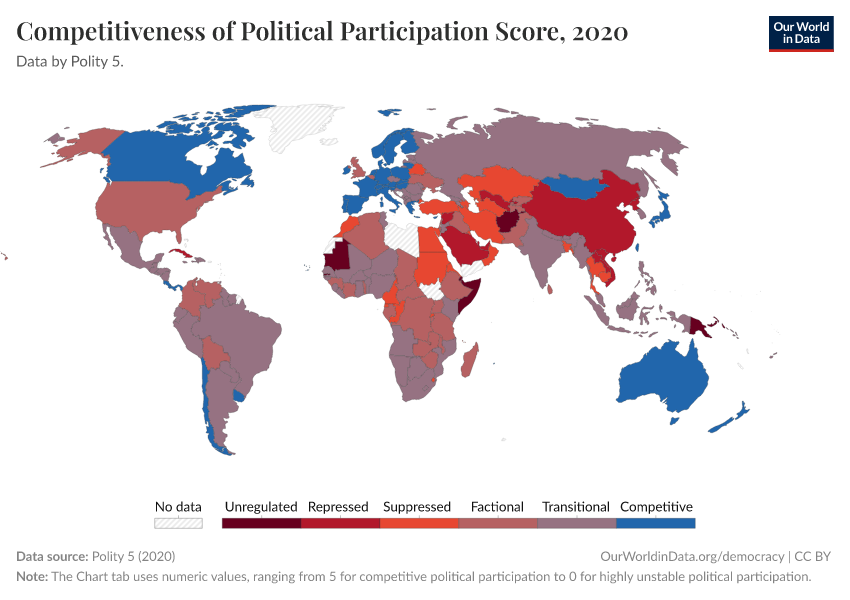 “Data Page: Competitiveness of political participation score”, part of the following publication: Bastian Herre, Lucas Rodés-Guirao, and Esteban Ortiz-Ospina (2013) - “Democracy”. Data adapted from Polity 5. Retrieved from https://search-refactor-react-query.owid.pages.dev/grapher/competitiveness-of-political-participation-score [online resource]How to cite this data