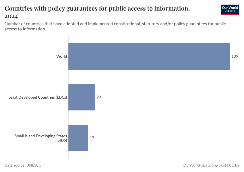 “Data Page: Countries with policy guarantees for public access to information”. Our World in Data (2025). Data adapted from UNESCO. Retrieved from https://search-refactor-react-query.owid.pages.dev/grapher/countries-that-adopt-guarantees-for-public-access-to-information [online resource]How to cite this data