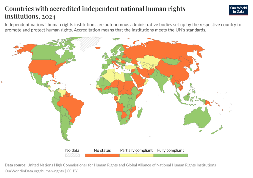 United Nations High Commissioner for Human Rights and Global Alliance of National Human Rights Institutions – processed by Our World in Data. “Countries with accredited independent national human rights institutions” [dataset]. United Nations High Commissioner for Human Rights and Global Alliance of National Human Rights Institutions, “Source: The Office of the United Nations High Commissioner for Human Rights (OHCHR) in collaboration with Global Alliance of National Human Rights Institutions (GANHRI).” [original data]. Retrieved September 17, 2025 from https://search-refactor-react-query.owid.pages.dev/grapher/countries-with-independent-national-human-rights-institution