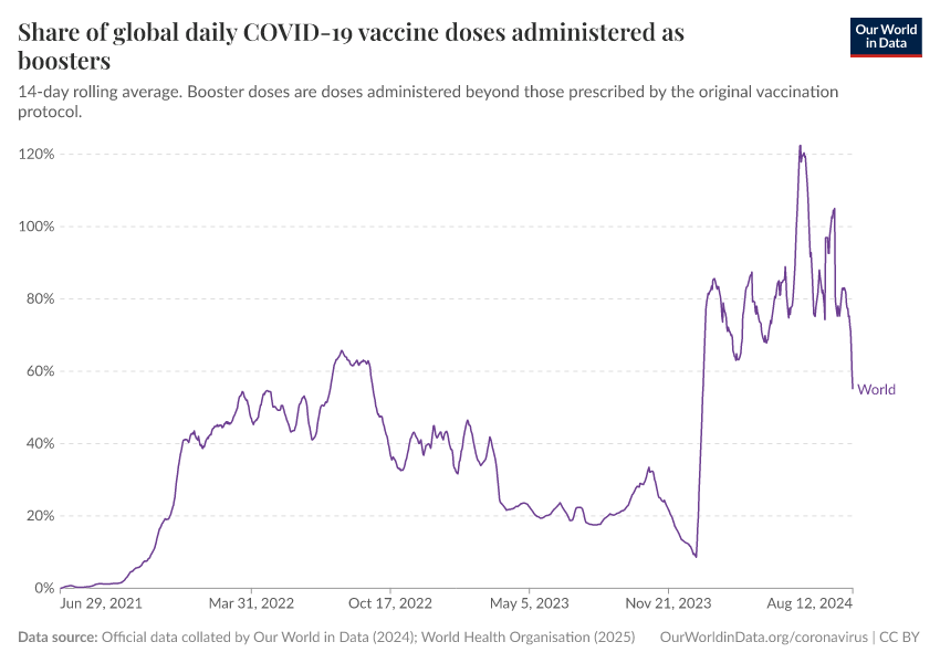 Official data collated by Our World in Data (2024); World Health Organisation (2025) – with major processing by Our World in Data. “Share of global daily COVID-19 vaccine doses administered as boosters” [dataset]. Official data collated by Our World in Data, “COVID-19, vaccinations”; World Health Organisation, “COVID-19, vaccinations (WHO)” [original data]. Retrieved September 17, 2025 from https://search-refactor-react-query.owid.pages.dev/grapher/covid-vaccine-share-boosters