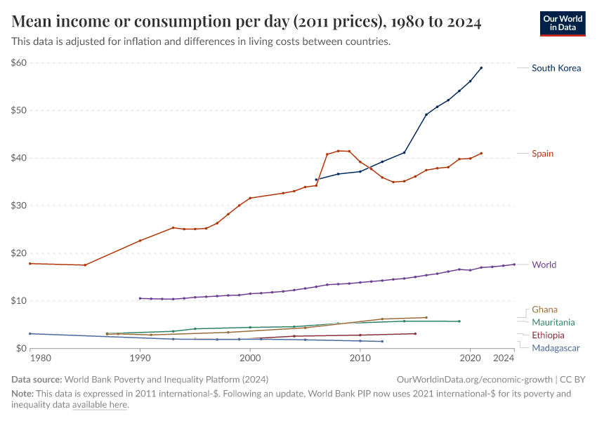 World Bank Poverty and Inequality Platform (2024) – processed by Our World in Data. “Mean income or consumption” [dataset]. World Bank Poverty and Inequality Platform, “World Bank Poverty and Inequality Platform (PIP) 20240627_2017, 20240627_2011” [original data]. Retrieved September 17, 2025 from https://search-refactor-react-query.owid.pages.dev/grapher/daily-mean-income-2011-ppp