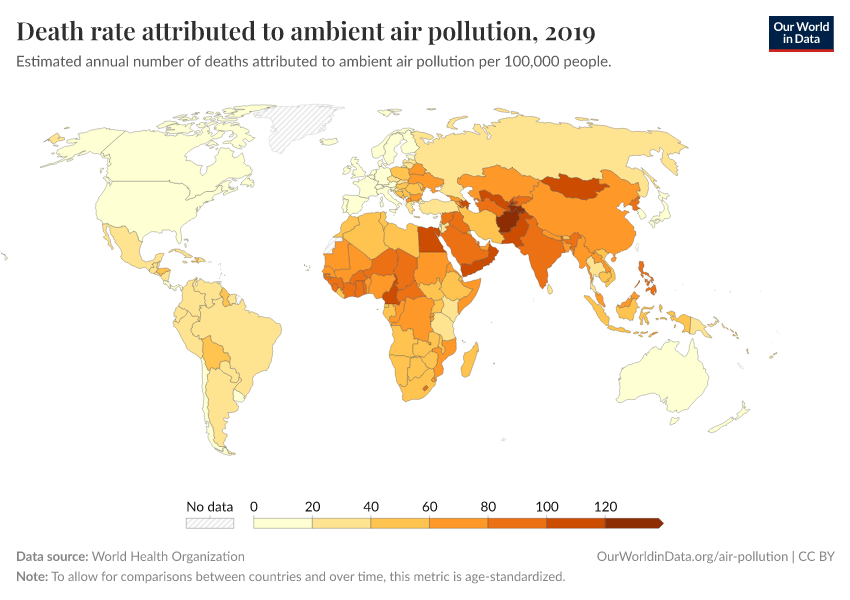 “Data Page: Death rate attributed to ambient air pollution”. Our World in Data (2025). Data adapted from World Health Organization. Retrieved from https://search-refactor-react-query.owid.pages.dev/grapher/death-rate-ambient-air-pollution [online resource]How to cite this data