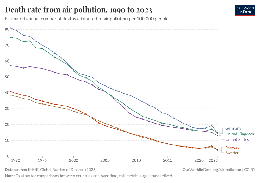 IHME, Global Burden of Disease (2024) – with minor processing by Our World in Data. “Death rate from air pollution” [dataset]. IHME, Global Burden of Disease, “Global Burden of Disease - Risk Factors” [original data]. Retrieved September 17, 2025 from https://search-refactor-react-query.owid.pages.dev/grapher/death-rate-from-air-pollution-per-100000
