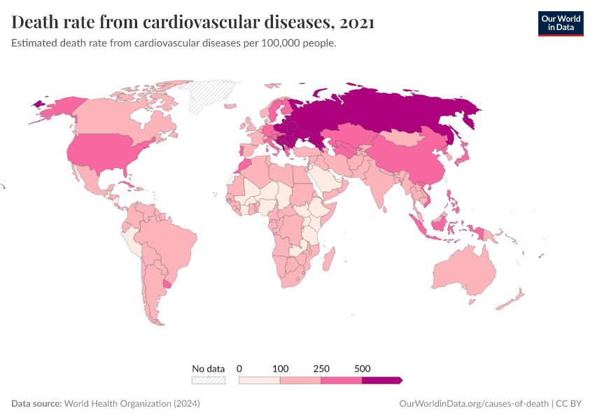 World Health Organization (2024) – with major processing by Our World in Data. “Death rate from cardiovascular diseases” [dataset]. World Health Organization, “Global Health Estimates” [original data]. Retrieved September 17, 2025 from https://search-refactor-react-query.owid.pages.dev/grapher/death-rate-from-cardiovascular-disease-ghe